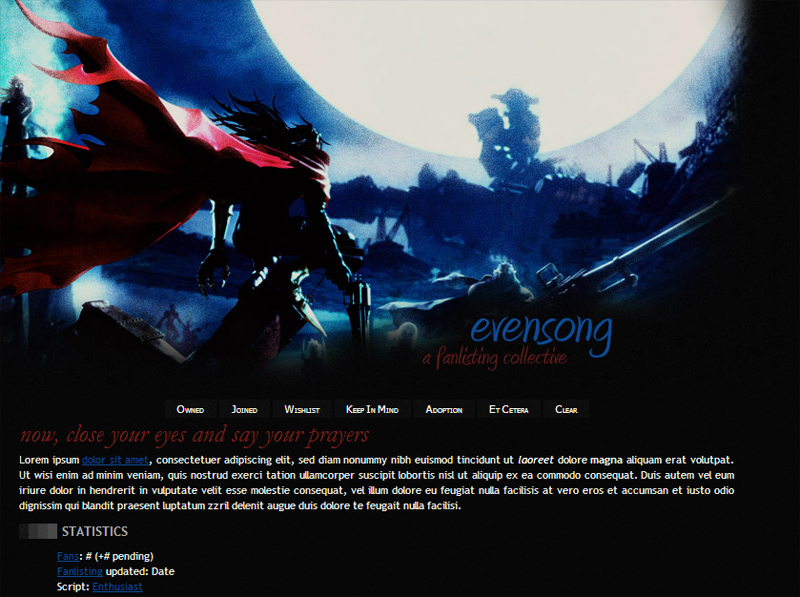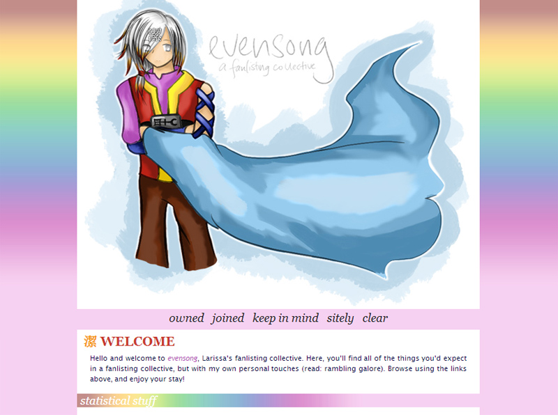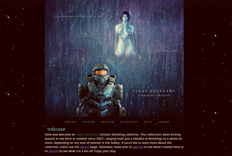 This fanlisting collective began in 2007, and has quite a few names during its run. I've always had a hard time settling on a name for my fanlisting collective, as evidenced by the fact I keep changing it, whoops. I took more care with choosing this one; I wanted something that wasn't specifically tied to a fandom that I might lose interest in or something that was generic enough that just worked on its own.